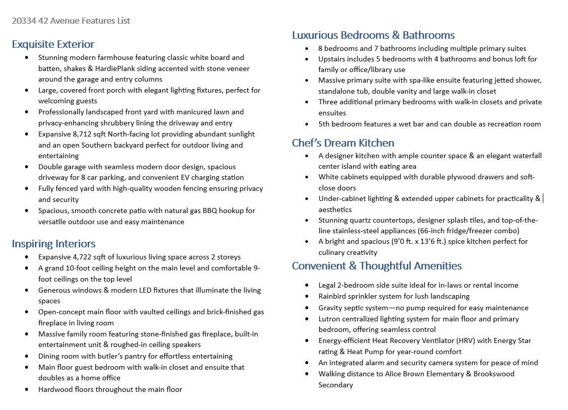 Modern 2 storey farmhouse in Brookswood, 4,722 sqft of luxurious living space, 8 beds + 7 baths, on 8,712 sqft north-facing lot. Open concept layout w/vaulted ceilings & gas F/P in living room, dining room w/butler’s pantry, & massive family room w/gas F/P & built-in entertainment unit. Chef’s dream kitchen w/quartz countertops, 66-inch fridge/freezer, large waterfall island w/eating area, ample cabinetry & spacious spice kitchen. Main floor bedroom w/walk-in closet & ensuite or can be office. Upstairs features 5 beds + 4 baths: large master bedroom w/large walk in closet & spa-like ensuite w/jetted shower & tub, 3 bedrooms w/walk-in closets & ensuites + 5th bed/rec room & bonus loft. Legal 2-bedroom airconditioned side suite, heat pump, sprinklers, hardwood floors & 8 cars parking!