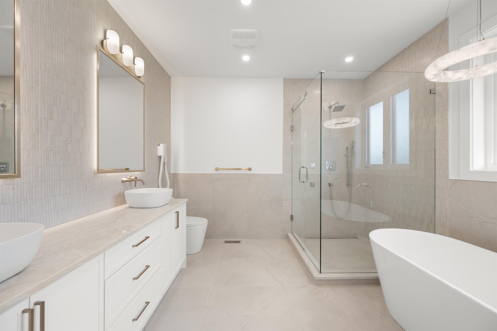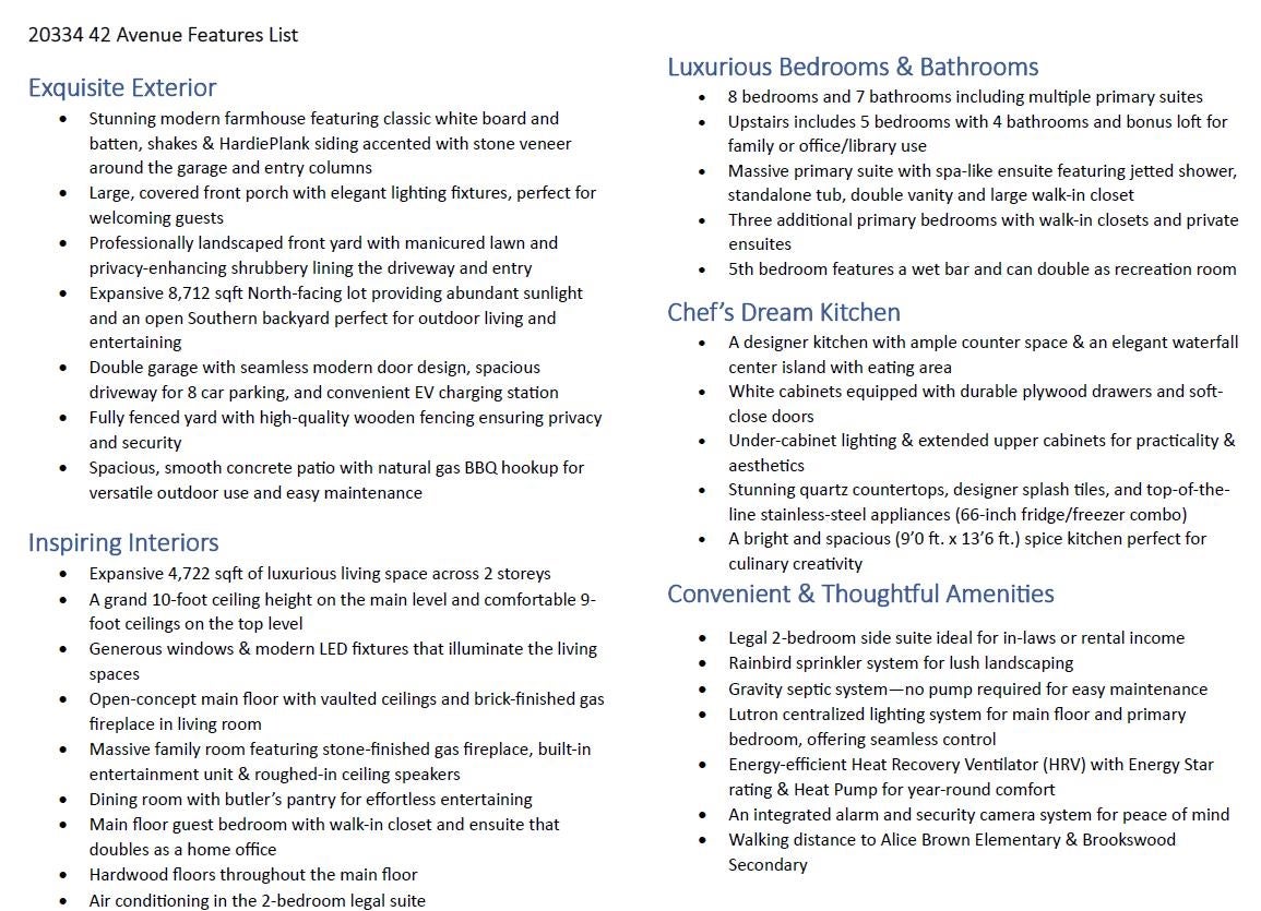Modern 2 storey farmhouse in Brookswood, 4,722 sqft of luxurious living space, 7 beds + 7 baths, on 8,712 sqft north-facing lot. Open concept layout w/vaulted ceilings & gas F/P in living room, dining room w/butler’s pantry, & massive family room w/gas F/P & built-in entertainment unit. Chef’s dream kitchen w/quartz countertops, 66-inch fridge/freezer, large waterfall island w/eating area, ample cabinetry & spacious spice kitchen. Main floor bedroom w/walk-in closet & ensuite or can be office. Upstairs features 4 beds + 4 baths: large master bedroom w/large walk in closet & spa-like ensuite w/jetted shower & tub, 3 bedrooms w/walk-in closets & ensuites + huge rec room w/wet bar & bonus loft. Legal 2-bedroom airconditioned side suite, heat pump, sprinklers, hardwood floors & 8 cars parking!